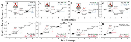 Relative solvation-free energy diagram of (a–d) HCOO− dehydrogenation and (e–h) HCO3− hydrogenation over Pd-based catalyst with different pyridine nitrogen doping amounts. * means adsorptive state. Reproduced with permission from Ref. [92]. Copyright 2018, American Chemical Society.