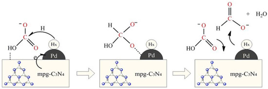 In consideration of the vital role of N-doping in the reversible H2 storage system, Huang, Wang, et al. also prepared mesoporous graphitic carbon nitride (mpg-C3N4) by pyrolysis of dicyandiamide to support Pd NPs [94]. The resulting Pd/mpg-C3N4 catalyst was proved to be an excellent catalyst for high-concentration KHCO3 hydrogenation (TOF = 4076 h−1) and the dehydrogenation of HCOOK (511 h−1) at 80 °C. Nitrogen species doped in mpg-C3N4 stabilized the Pd NPs with high dispersion and small size, changed the electronic state of the Pd through donating electrons toward the Pd, and formed hydrogen bonds with OH− in HCO3−, which synergistically boosted the hydrogenation of KHCO3. In addition, Pd/mpg-C3N4 was sturdy and could be reused six times during the hydrogenation reaction and three times during the dehydrogenation reaction. They also provided a possible mechanism for HCO3− hydrogenation catalyzed by Pd/mpg-C3N4 (Figure 8). First, HCO3− was adsorbed on the Pd/mpg-C3N4 surface through hydrogen bonds between the OH− in HCO3− and the N functionalities in mpg-C3N4. Then, the positively polarized C in the HCO3− was attacked by the H proton generated by H2 dissociation on the Pd NPs, forming HCOO−.