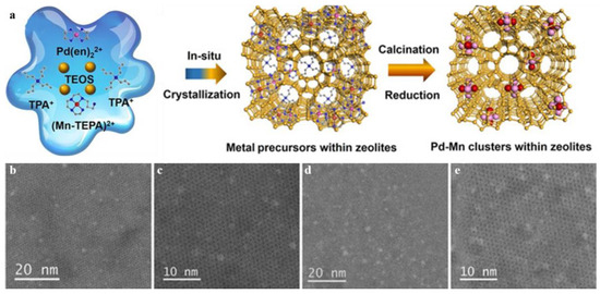 In 2020, Yan, Yu, et al. confined Pd-Mn bimetallic clusters to silicalite-1 zeolites via a ligand-protected approach (Figure 9a) [96]. The aberration-corrected STEM-HAADF images showed that the size of the monometallic Pd and PdMn clusters was similar, about 1 nm or smaller, indicating that the introduction of Mn components did not change the size of the Pd clusters (Figure 9b–e). XPS measurement confirmed that most Pd and Mn species in the PdMnx@S-1 sample were confined within the zeolite crystals. The results of thermal stability investigation demonstrated that PdMn0.6@S-1 displayed significantly enhanced the thermal stability compared to Pd/S-1-im synthesized via an incipient wetness impregnation approach. XANES and in situ analysis revealed that the introduction of Mn components facilitated the formation of electron-rich Pd in PdMn0.6@S-1 through electron transfer from the Mn to the Pd. The resultant PdMn0.6@S-1 catalyst achieved a TOF of 2151 h−1 for formate generation by CO2 hydrogenation at 80 °C and an initial TOF of 6860 h−1 for CO-free H2 release by FA decomposition at 60 °C. The observed high activity of the CO2 hydrogenation and FA decomposition gave credit to the generation of highly dispersed metal clusters and a synergistic effect of the bimetallic components in the PdMn0.6@S-1. Moreover, PdMn0.6@S-1 also displayed excellent reusability in the CO2 hydrogenation and FA decomposition reactions, with an unchanged formate generation rate and H2 release rate after five consecutive runs, respectively.