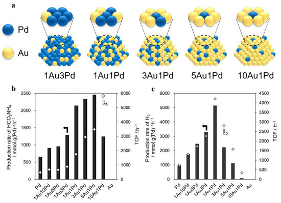 In 2019, Shishido et al. revealed the correlation between the electronic property and structure of bimetallic alloys and the activity for reversible conversion between NH4HCO3 and NH4HCO2 through activated carbon-supported Pd-Au alloy catalysts (AuPd/AC) [97]. HAADF-STEM characterization indicated that the mean size of AuPd NPs in the AuPd/AC with a Au/Pd molar ratio of 0.1~10 was ca. 3 nm. XPS and XAFS analyses both proved the transfer of electrons from the Pd to the Au in the bimetallic catalyst. According to the coordination number derived from EXAFS characterization, the configuration and distribution of the Au and Pd atoms on the bimetallic alloy NP surface changed with the Au/Pd molar composition (Figure 10a). If the ratio of the Au/Pd was high, Au atoms encircled a single Pd atom (10Au1Pd/AC). If the molar ratio of the Au/Pd was 1 (1Au1Pd/AC), the Pd atoms were encircled by equal amounts of Pd and Au atoms. The reaction results demonstrated that all the Pd-Au/AC binary catalysts demonstrated superior activity than that of the corresponding monometallic species for reversible hydrogenation and dehydrogenation reactions. The difference in the electronic state and local structure of AuPd bimetallic NPs caused by different bimetallic compositions affected their catalytic activity for the reversible reaction. For the hydrogenation of NH4HCO3 (Figure 10b), the TOF value increased monotonically with an increasing Au/Pd molar ratio, and 10Au1Pd/AC exhibited the best activity, with a TOF of 5820 h−1 at 60 °C. Whereas a volcano-type relationship was found between the TOF values for H2 production and the Au/Pd ratios (Figure 10c), the optimum catalyst was 1Au1Pd/AC, exhibiting the best TOF of 4200 h−1 at 40 °C.