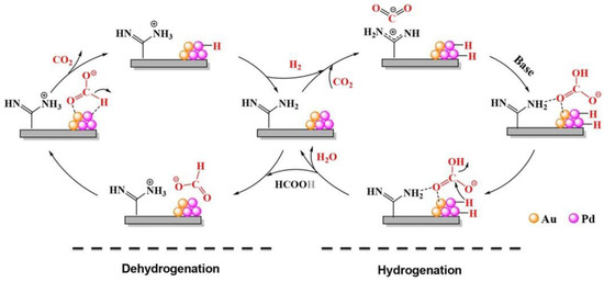 Very recently, Ren et al. synthesized L-arginine-modified carbon-anchored PdAu alloy catalysts (PdAu/AC-LA) for reversible H2 storage under ambient conditions [99]. By adjusting the introduction amount of LA and the composition of Pd and Au, the optimal catalyst Pd1Au2/AC-LA showed good activity for H2 release from FA (TOFs = 1760 h−1) and CO2 hydrogenation (TOFs = 138 h−1) at 25 °C. The comprehensive characterization results demonstrated that the alloying effect of the PdAu and the modification of the strongly basic L-arginine improved the adsorption of the reactants (Figure 11), thus increasing the activity of the Pd1Au2/AC-LA.