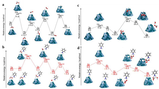 Potential energy profiles for H2 generation from FA (a) without and (b) with phenylamine. Potential energy profiles for CO2 hydrogenation (c) without and (d) with phenylamine. Reproduced with permission from Ref. [100]. Copyright 2020, American Chemical Society.