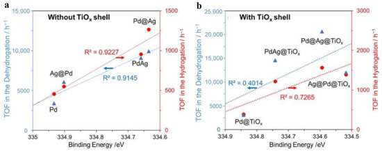 In 2020, Mori, Yamashita, et al. explored the effect of a Pd-Ag alloy structure on the interconversion between HCOONa and NaHCO₃, including a PdAg solid solution (PdAg), a Pd core-Ag shell structure (Pd@Ag), and a Ag core-Pd shell structure (Ag@Pd) [102]. As shown in Figure 13a, the alloy structure greatly affected the electronic property and activity of the Pd for reversible reactions. Among various alloy structures, Pd@Ag/TiO2 with electron-rich Pd demonstrated the highest activity for HCOONa dehydrogenation and NaHCO3 hydrogenation with TOF values (calculated based on the surface Pd atoms) of 20,578 and 1568 h−1, respectively. To further improve the catalytic activity, the authors modified these alloy catalysts with TiOx shells. As shown in Figure 13b, the introduction of TiOx shells facilitated the improvement of the activity of all the Pd-Ag alloy catalysts. They concluded that the generation of the Pd-TiO2 interface was responsible for the improved catalytic activity. The characterization results and kinetic studies revealed that the generation of the Pd-Ag alloy and Pd-TiO2 interface facilitated the cleavage of the C–H bonds in HCOONa dehydrogenation and improved the adsorption and activation of bicarbonate during the hydrogenation process.