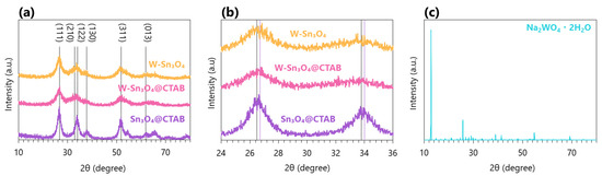 Figure 1. (a) XRD patterns, (b) the enlarged spectra in the range of 24 to 36 degrees of Sn3O4@CTAB, W-Sn3O4@CTBA, and W-Sn3O4, and (c) XRD pattern of pure sodium tungstate (IV) dihydrate as 2θ values.