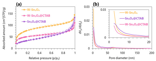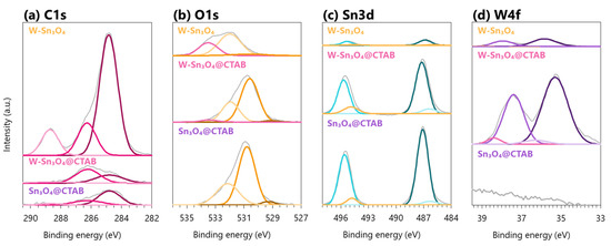 The O1s spectra in Figure 5b show the apparent peak around 530 eV attributed to crystal lattice oxygens. In particular, each binding energy of Sn3O4@CTAB, W-Sn3O4@CTAB, and W-Sn3O4 are located at 530.8 eV, 530.6 eV, and 530.6 eV, respectively, where there appear to be slight shifts of about 0.2~0.3 eV to lower binding energy due to the adjustment of the metals–oxygen bonding state via W-modification and CTAB additive. Other small shoulders are observed at 530.0 eV and 533.5 eV, probably due to adsorbed water molecules on the surface and the hydroxyl groups, respectively.