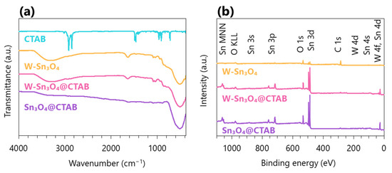 The chemical structural information about the chemical bonding or molecular structures of materials can be illustrated via Fourier-transformed infrared (FT-IR) spectra in Figure 4a. The characteristic peaks at 2918 cm−1 and 2850 cm−1 correspond to the C–H bond stretching vibration from methyl and methylene groups of CTAB. Because the two absorption bands mentioned above were observed around 2900 cm−1 in the materials prepared with CTAB (Sn3O4@CTAB and W-Sn3O4@CTAB), a small number of linear molecules of CTAB are present inside or on the surface [37]. Other peaks observed in CTAB were attributed to the alkyl chains as hydrophobic groups. The strong and wide band around 3400 cm−1 arises from the stretching vibration of hydroxyl groups on surface hydroxyl groups or adsorbed water due to the re-adsorption of water from the ambient atmosphere. The broad band around 500 cm−1 and 1470 cm−1 is caused by the vibration of the Sn–O bond and the bending vibration of Sn-OH, respectively [38]. Due to the trace amount of modified tungsten, there was no evidence of its presence in the W–O bond.