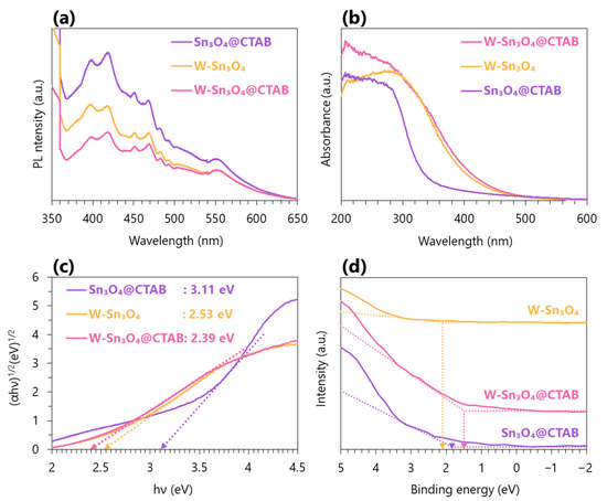 In photocatalytic reactions, the recombination of photoinduced electron–hole pairs significantly affects their activity [41]. Therefore, photoluminescence (PL) measurements were performed to investigate the efficiency of free charge carriers trapping and transfer in the proposed photocatalysts via the intensity of fluorescence produced when photoinduced electrons recombine with holes, as shown in Figure 6a. The synthesized samples showed a visible emission centered around 420 nm. The PL intensity of W-Sn3O4 is lower than that of Sn3O4 without tungsten in the same wavelength range, which was attributed to interference with the recombination of photoinduced electrons and holes because the tungsten could act as an electron trapping site. The fluorescence emission of W-Sn3O4 with the proper quantity of CTAB was further significantly inhibited, suggesting the presence of possible defects and/or the optimized band structure in the photocatalysts induced by the structure-directing agent.