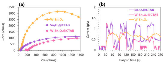 The separation efficiency of the photogenerated electron–hole pairs in the photocatalyst was analyzed using a three-electrode system. As seen from the electrochemical impedance spectroscopy (EIS) Nyquist plots in Figure 7a, the W-Sn3O4@CTAB photocatalyst exhibits the smallest arc radius with a lower charge transfer resistance, which means that the sample exhibited the highest electron transport rate. Transient photocurrent response (I-t) analysis of the prepared samples was then performed to verify numerous on–off cycles under visible light. The W-Sn3O4@CTAB photocatalyst showed a good photocurrent response, suggesting that the structure modified by tungsten and CTAB with great synergistic interactions can effectively transfer the excited charge carriers and shorten the reunion rate.