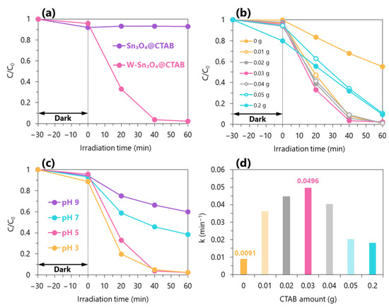 Figure 8. Effect of (a) tungsten modification, (b) amount of CTAB in the proposed preparation method, and (c) pH of the sample solution in the dispersion of W-Sn3O4@CTAB (0.03 g) on photocatalytic decolorization of MO under visible light irradiation, and (d) the apparent reaction rate constant of each photocatalyst with different amounts of CTAB.