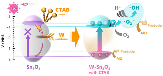 In summary of the above results, the suggested photocatalytic mechanism and photoinduced charge transfer during MO decolorization on the proposed photocatalysts are shown in Figure 10. First of all, due to the introduction of tungsten into mixed-valence tin oxides (Sn3O4), the visible-light-harvesting performance of W-Sn3O4 materials was considerably enhanced. In detail, new impurity levels originating from tungsten owing to its multiple oxidation states are formed within the broadband structure with limited photoresponsivity of Sn3O4, resulting in decreased bandgap energy. Moreover, the addition of CTAB during crystal growth further optimizes the final photocatalytic morphology, with this result leading to improved visible-light absorption ability.