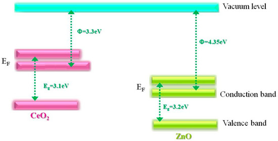 Energy band diagram of CeO2 and ZnO n-type semiconducting materials.