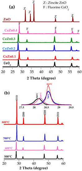 X-ray diffractogram of (a) CeZnx calcined at 700 °C and (b) CeZn0.1 calcined at different temperatures. “x” is the Zn content in solid solution.