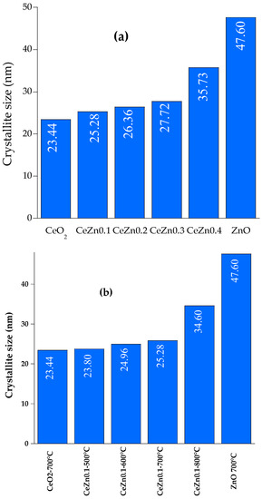 Crystallite sizes of samples (a) CeZnx calcined at 700 °C and (b) CeZn0.1 calcined at different temperatures.
