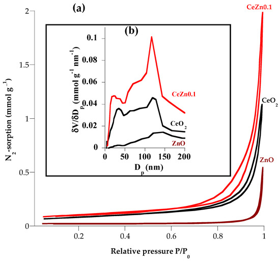 Surface area and pore size are among the key indicators of good photocatalytic efficiency of materials. Thus, texture parameters of the different photocatalysts calcined at 700 °C were determined using nitrogen (N2) adsorption–desorption data at 77 k (Figure 4). The mesoporosity of the surface of the studied materials was confirmed by the presence of hysteresis. As shown in Table 2, the BET surface area of cerium oxide is 6.44 m2·g−1, while the surface area of pure zinc oxide is 0.65 m2·g−1. Interestingly, the surface area is higher for CeZn0.1 (SBET = 8.05 m2·g−1) than for ZnO or CeO2. This increase could be due to better dispersion and a decrease in the ZnO size inside the CeO2 matrix, allowing the extension of the network through hybrid bonds such as Zn-O-Ce. Pore size distribution shows average pore diameters of 30, 70, and 41 nm for CeO2, ZnO, and CeZn0.1, respectively (Table 2).