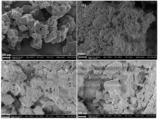 The surface morphologies of the ZnO, CeO2, and CeZnx oxides calcined at 700 °C were studied by SEM (Figure 5). ZnO particles are in the form of irregularly shaped elongated hexagons and quasispherical aggregated nanoparticles, while CeO2 nanoparticles appear as amorphous agglomerates. However, the addition of ZnO to CeO2 seems to affect the morphology and size of the resulting nanocomposites. Figure 5c,d clearly shows a decrease in the size of the elongated CeZn0.1 hexagons with a slight increase in porosity.