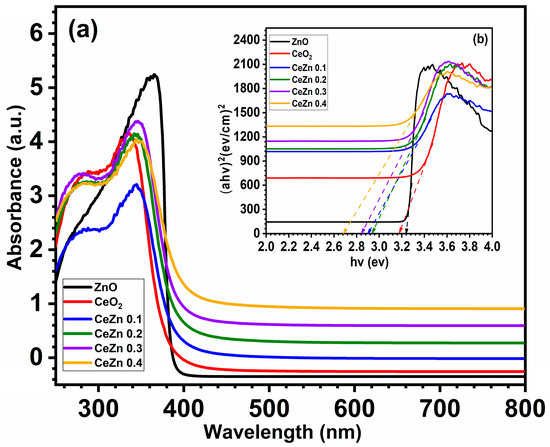 (a) UV-vis absorption spectra of ZnO; CeO2 and CeZn0.1 and (b) their Tauc plots.