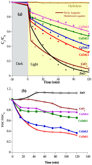 The photocatalytic efficiency of Ce1−xZnxO2−x solid solution materials (termed CeZnx) compared to CeO2 and ZnO oxides was assessed for the degradation and mineralization of diclofenac in aqueous solution under UV-visible irradiation (λmax = 300–800 nm). In the absence of the catalyst, diclofenac was stable during sunlight irradiation, and its photolysis was insignificant. It should be noted that photocatalysis is coupled to pollutant adsorption at the catalyst surface after diffuse migration close to this surface, and degradation rate is proportional to the recovery rate of active sites on the catalyst surface. Tests performed in the dark showed no significant reduction in the initial diclofenac concentration. The decrease of diclofenac concentration observed under sunlight showed the photocatalytic efficiency of the various produced photocatalysts. Lower photocatalytic activity was observed with CeZnx, solid solution materials than with pure oxides (ZnO and CeO2) (Figure 8a). In contrast, variations in total organic carbon showed higher mineralization activity with CeZnx solid solution catalysts than with ZnO (no mineralization) and CeO2 (less than 20% mineralization after 2 h irradiation) (Figure 8b). Optimal mineralization was observed with the Ce0.9Zn0.1O1.9 catalyst, which showed about 65.50% diclofenac mineralization and photodegradation after only 2 h irradiation.