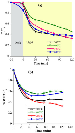 Heat treatment of Ce0.9Zn0.1O0.9 has a significant effect on its photocatalytic activity (Figure 9). Catalysts calcined at 500 or 700 °C show the highest photocatalytic activity (Figure 9a) and drug mineralization (Figure 9b). The improved photocatalytic performance could be due to the heterojunction between the Ce-O and Zn-O bonds and the presence of oxygen vacancies that narrow the band gap of the CeZnx solid solution materials.