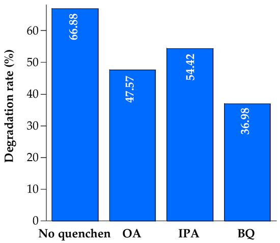 It is well known that -OH radicals are not only formed via holes in the valence band (VB) but also via electrons in the conduction band (CB). When oxygen O2 is available and adsorbed on the surface of the catalyst, it can scavenge electrons from the VB to form superoxide radicals O2•−. To clarify whether the degradation mechanism of diclofenac involves •OH or •O2− radicals, or holes, we performed scavenging experiments using specific inhibitors for each of these active species. In this study, benzoquinone (BQ), ammonium oxalate (OA), and isopropanol (IPA) were added to the reaction solutions as scavengers for O2•− radicals, h+ holes, and •OH radicals, respectively, at a concentration of 5 mmol/L before the catalyst addition. We used the same degradation process detailed earlier. After 2 h irradiation, the concentration of diclofenac decreased by 67% without scavengers and by 54, 48, and 37% with inhibition of •OH radicals, h+ holes, and O2•− radicals, respectively (Figure 10). These results show that the relevance of active species in diclofenac photocatalysis is as follows: O2•− radicals > h+ holes > •OH radicals.