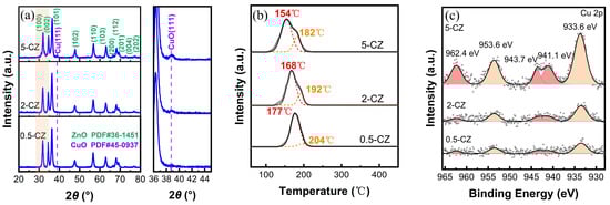 Cu/ZnO catalysts (CZ catalysts) with different Cu mass loadings of 0.5, 2, and 5 wt% were synthesized and named 0.5-CZ, 2-CZ, and 5-CZ, respectively. XRD analysis on the as-prepared 0.5-CZ, 2-CZ, and 5-CZ catalysts (Figure 1a) showed peaks corresponding to the (111) facet of CuO (JCPDS card no. 45-0937) [], and the (100), (002), and (101) facets of ZnO (JCPDS card no. 36-1451) []. The surface chemical state of 0.5-CZ, 2-CZ, and 5-CZ catalysts was also measured using XPS. The Zn 2p3/2 peak at 1021.6 eV suggested the chemical state of Zn species was mainly ZnO [] (Figure S1a). The O 1s spectra showed the presence of carbonate or hydroxylate species on the catalyst surface after calcination [] (Figure S1b). As the Cu loading increased, the diffraction peaks of ZnO exhibited a shift towards higher angles, indicating lattice contraction, which could be attributed to the incorporation of Cu into the ZnO lattice. Additionally, the peak width of CuO(111) and ZnO(110) decreased with increasing Cu loading, suggesting the growth of Cu and ZnO crystals and implying that the Cu loading influenced the stability of ZnO. Table 1 presented the average particle size of CuO, calculated from the diffraction signal of CuO(111) using the Scherrer equation; the BET surface area and total pore volume of the calcined samples are also summarized. In agreement with XRD results, the increased Cu loading is accompanied by a decrease in the specific surface area of CZ catalysts. In addition, larger Cu metal particles formed on the surface blocked the ZnO pores according to the pore size data [].