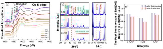 (a) In situ XANES spectra at Cu K-edge of 2-CZ catalyst obtained during 1 bar H2 reduction process. (b) XRD patterns of reduced catalysts with different Cu-loadings. (c) The ratio of the peak intensity of ZnO(002) (2θ = 34.4°) relative to ZnO(100) (2θ = 31.7°).
