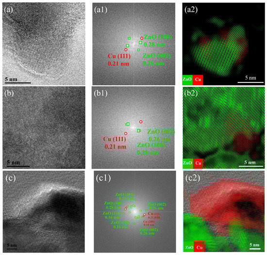 HR-TEM images for reduced Cu/ZnO catalysts (a) 0.5-CZ, (b) 2-CZ, (c) 5-CZ. (a1–c1) Corresponding FFT patterns and (a2–c2) Fourier-filtered Cu, ZnO lattice features stained (ZnO-green, Cu-red).