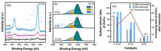 Quasi-in situ XPS spectra of (a) Cu 2p and (b) O 1s for reduced catalysts; (c) surface Zn/Cu atomic ratio obtained using XPS and increasing atomic ratio of Zn/Cu after reduction as a function of Cu loading.