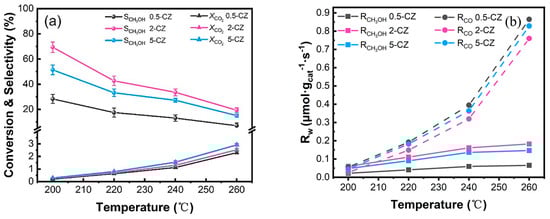 is the conversion rate of CO2 (%), is the molar flow rate of CO2 (mol·s−1), is the selectivity of CO or CH3OH (%), and m is the catalyst weight (g).
