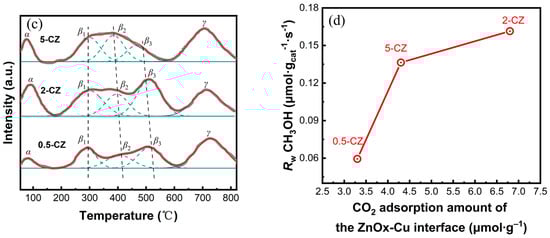 In order to gain further insights into the superior performance of the 2-CZ catalyst, CO2-TPD was employed to investigate the CO2 adsorption properties of the CZ catalysts, as depicted in Figure 6c. The TPD profiles can be deconvoluted into several peaks, indicating the desorption from different types of basic sites. Peaks α, β, and γ correspond to CO2 desorption from weakly basic sites associated with the hydroxyl group, moderately basic sites attributed to Zn–O pairs, and strongly basic sites linked to low-coordinated oxygen atoms [], respectively. Among these, moderately basic sites have been suggested as active sites for CO2 hydrogenation []. Based on the TPD profiles, Table 2 presents the quantitative measurements of basic sites on the CZ catalysts. The CO2 desorption peaks in the range of 350 °C~600 °C shift to lower temperature with increasing Cu loading, probably due to the interface structural changes of the catalysts. The β desorption peak was found to be the largest for the 2-CZ catalyst, and the β2 and β3 peaks could be attributed to CO2 desorption at the interfacial sites and ZnO overlayers. The peak area of β2 and β3 can be, therefore, regarded to quantify the enhancement of CO2 adsorption. From above, a correlation between the migration of ZnOx species onto Cu particles, the adsorption property of CO2, and methanol selectivity could be built.
