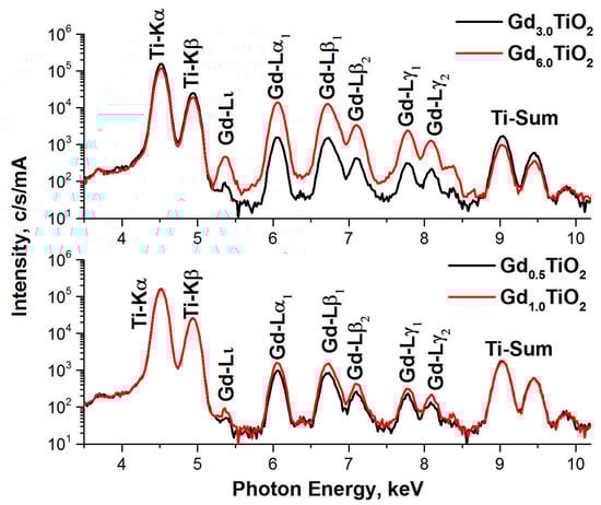The EDXRF spectra of the Gdx/TiO2 nanocomposites.