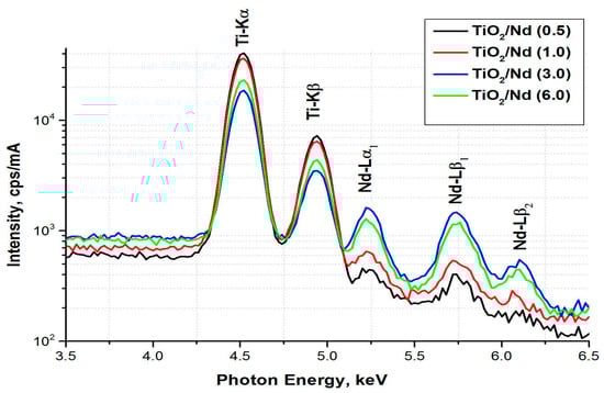 The EDXRF spectra of the Ndx/TiO2 nanocomposites.