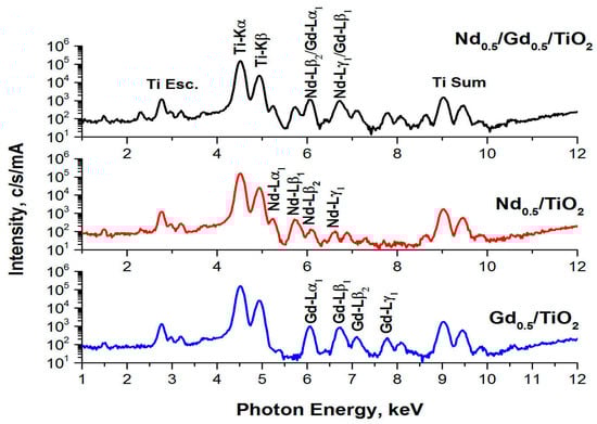 The EDXRF spectra of the Gd0.5/TiO2, Nd0.5/TiO2, and Gd0.5/Nd0.5/TiO2 nanocomposites.