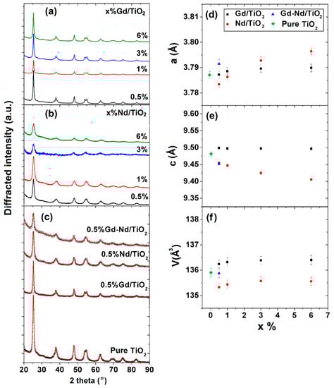 XRD patterns of (a) Gdx/TiO2 NPs and (b) Ndx/TiO2 NPs, (c) calculated (red) and recorded (black) diffraction patterns of Gd0.5/TiO2, Nd0.5/TiO2 and Gd0.5/Nd0.5/TiO2, (d,e) lattice parameters as a function of Gd and Nd content, (f) cell volume as a function of Gd and Nd content.