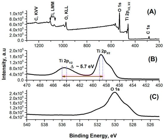 X-ray photoelectron spectroscopy analysis of the pure TiO2 nanoparticles including (A) a survey and core level spectra of (B) Ti 2p and (C) O 1s.