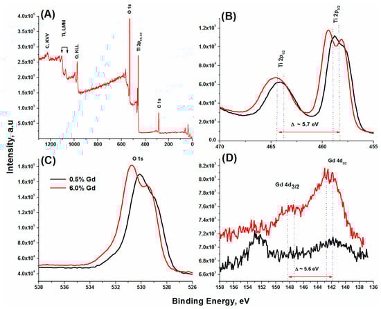 X-ray photoelectron spectroscopy of the Gd/TiO2 nanoparticles at 0.5% and 6.0% of Gd including (A) a survey and core level spectra of (B) Ti 2p, (C) O 1s, and (D) Gd 4d.