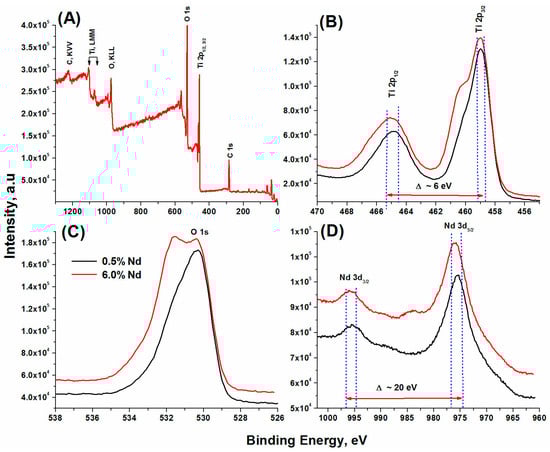 X-ray photoelectron spectroscopy of the Nd-doped TiO2 nanoparticles at 0.5 and 6.0 wt.% of Nd including (A) a survey and core spectra of (B) Ti 2p, (C) O 1s, and (D) Nd 3d.