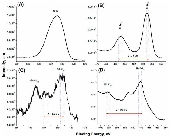 As shown in Figure 6 and Figure 7, these shifts in the BE of Ti 2p and O 1s peaks could be ascribed to the formation of Ti –Gd and Ti–Nd bonds on the grain boundaries of the crystallites, reducing the Ti4+ BE. Figure 6 and Figure 7 revealed an increase of Nd 3d and Gd 4d peak intensities upon increasing the doping level from 0.5 to 6.0 wt.%. At a concentration of 0.5 wt.% of Nd and Gd, the O 1s and Ti 2p intensities had a remarkable decrease. The spin orbit splitting of Nd 3d and Gd 4d remained the same as the previous cases.