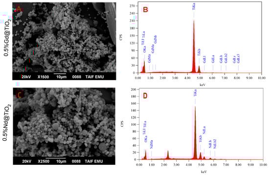 SEM/EDX examinations of Gd0.5/TiO2 (A,B) and Nd0.5/TiO2 NPs (C,D).