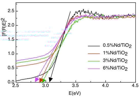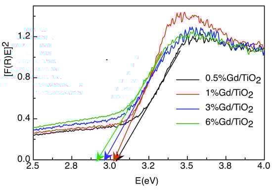 To estimate the optical band gap, UV-vis diffuse reflectance spectra were measured to analyze the red-shifts in the absorption regions. The Kubelka–Munk equation αhν = A(hν −Eg)2, where α, h, ν, and Eg and A are the absorption coefficient, Plank constant, light frequency, band gap, and the proportionality constant, respectively, was used for band gap determination, Figure 11 and Figure 12. For pure TiO2, a band gap energy of 3.18 eV was determined, which is in accordance with that of other reports [52,53,54], while for RE-doped TiO2, the band gap energy decreased due to the red-shift of absorbance (see Figure 11 and Figure 12 and Table 9), suggesting that gadolinium and neodymium improved the visible light absorbance of TiO2.