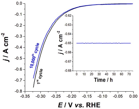 As a well-known eminent HER electrocatalyst, the Pt/C catalyst achieved amongst the investigated catalysts the lowest HER’s onset potential, EHER~−15 mV vs. RHE, with the steepest reduction (catalytic) currents. In contrast, the bare GC electrode displayed inferior catalytic activity, clear from its humble catalytic current generated at a larger EHER (−720 mV vs. RHE).