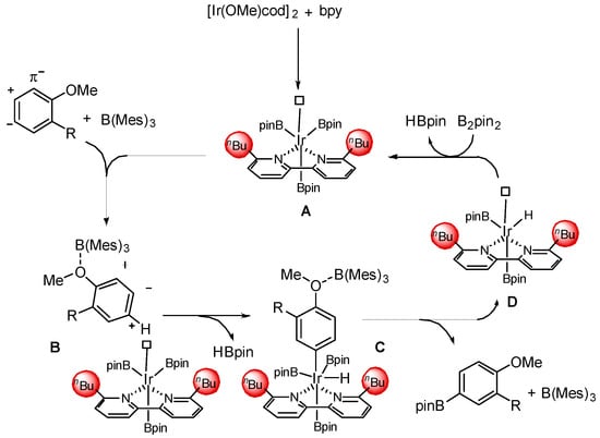 According to the initial hypothesis, the para-selective C-H borylation can be explained by a mechanism initiated by the formation of a bipyridyl-Ir-Bpin complex A with two cis-N ligands, three Bpin ligands, and a vacant coordination site (square). As anisole substrates and Lewis acid (B(Mes)3) were added to the reaction system, the vacant coordination site of complex A would facilitate the cleavage of the C-H bonds at the para-position due to the lower electron density caused by the coordination of Lewis acid with anisole substrate and forming complex B. After eliminating a HBpin, the complex C, primarily activating the para-Ar-H bonds, was formed. Then, the para-borylates product was given after reductive elimination, and ligand exchange of complex D occurred with B2pin2 to regenerate complex A (Figure 2).