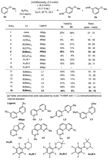 Anisole borylated derivatives, as an important structural unit, are widely utilized in many areas of chemistry, including pharmaceuticals, perfumes, and dyestuffs [40]. However, the iridium-catalyzed C-H borylation of anisole, usually gives a mixture of meta- and para-borylated products, and the ratio is about 3:1. It is difficult to obtain a single isomer of a borylated product, especially for the para-isomer. Herein, we report an improved para-selective C-H borylation of anisole assisted by the combination of a Lewis acid and a bulky bipyridyl ligand. We proposed that the mechanism is that the methoxy group, as a strong electron-donating group, will increase electron density at the ortho- and para-positions of the anisole substrate, which makes the electron-deficient meta-position easily functionalized. Once the Lewis acid is coordinated with the methoxy group, it results in a decrease in electron density at the para-position, which will lead to an increase in para-selectivity (Figure 1 (4)).