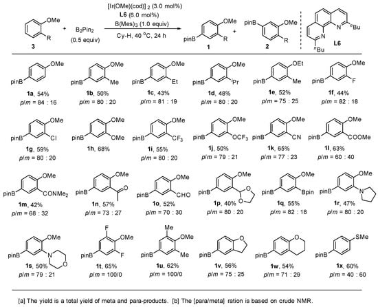In a glove box, an oven-dried 10 mL sealed tube with a magnetic stir bar was charged with [Ir(OMe)(cod)]2 (3.0 mol%), L6 (6.0 mol%), B2Pin2 (0.5 equiv.), and cyclohexane (1.0 mL). The seal tube was moved to a preheated metal heating block (50 °C) for 30 min, after which the color of the mixture turned deep green. Upon cooling to room temperature, anisole substrate 3 (0.5 mmol), B(Mes)3 (1.0 equiv), and cyclohexane (1.0 mL) were added sequentially. The reaction vessel was removed from the glovebox and stirred at 40 °C. After 24 h, the reaction mixture was cooled to room temperature, volatiles were removed under reduced pressure, and the yield and the regio-isomer ratio were checked by 1H NMR using 1,1,2,2-tetrachloroethane as an internal standard. The para-borylated product was separated by GPC.