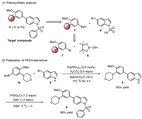 5-(4-methoxyphenyl)-1-(phenylsulfonyl)-1H-indole (the target compound; R=H) as a PED4 inhibitor was usually synthesized through Suzuki–Miyaura cross-coupling between para-borylated anisole (1′) and phenylsulfonyl protected 5-bromoindole (4′) (Scheme 3 (1)). The introduction of functional groups on the moiety of para-borylated anisole is a useful way to enrich the diversity of PED4 inhibitor compounds. However, substituted para-borylated anisole generally needs to be prepared from the corresponding 4-bromoanisole (7) and borylate (8), which not only increases the synthesis cost but also does not comply with the principle of atom economy [41]. On the contrary, the improved para-borylation of anisoles developed by us could easily synthesize a series of para-borylated anisoles with an ortho-substituent (1′). As a representative example, a derivative of PDE4 inhibitor (6) was synthesized from product 1s with an ortho-morpholinyl group through two steps [42,43]. First, a palladium-catalyzed cross-coupling reaction between 1s and 5-bromoindole (4) gave the coupling product (5) in a 65% yield without protecting the NH group. Then, the desired product (6) was obtained via acylation of 5 with phenylsulfonyl chloride in a yield of 88% (Scheme 3 (2)).