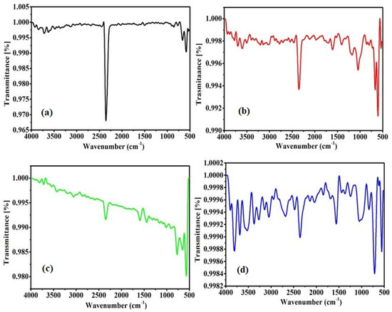 The types of chemical bonds present on the prepared samples were verified using the FTIR characterization technique. Figure 2 shows the FTIR spectrum obtained for the G, GO, precursor complex, and the modified GO powder. Figure 2a shows a very sharp peak at 2348 cm−1, which corresponds to a free O=C–O bond. There are two broad bands observed in the range from 3500 cm−1, and a band at 1646 cm−1 (Figure 2b); these are typical bands of both stretching and bending of O–H bonds, and are attributed to the interaction of adsorbed water molecules on the GO surface [26]. This indicates the presence of hydroxyl groups in the GO network. Furthermore, a weak band was observed at 2336 cm−1, corresponding to O–C=O bonding, which are the bonds present in the hexagonal GO [21]. Some of the peaks were observed at 1610, 1172, and 1040 cm−1, attributed to the presence of a C=C strain on the aromatic ring of GO, the C–O bond of the epoxy groups, and C–OH strain for the alkoxy groups in the GO sheets, respectively. The other weak bands localized at 2900, 2100, and 1638 cm−1 can be assigned to the vibrations of C–H bond, the C=O strain, and the vibration of C=C conjugates of the GO, respectively [22]. Figure 2c shows peaks at 640, 1227, 1646, 1706, and 3427 cm−1 of the nickel precursor complex, which corresponds to the previously reported work [23]. Figure 2d shows peaks at 640 cm−1 and a broad peak at 3427 cm−1. A peak at 2348 cm−1 in graphite completely disappeared, indicating the modification of a small amount of nickel complex with GO to form Ni-GO.