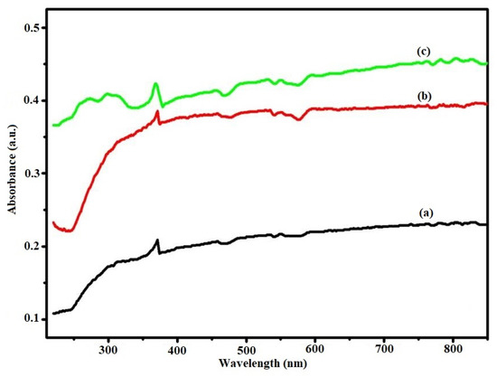 UV–visible absorption measurement is one of the most important methods to evaluate the optical properties of semiconductors. Figure 3 shows the UV–visible absorption spectrum of the G, GO, and Ni-GO nanocomposites. Two broad absorption peaks can be seen around 372 nm and 458 nm in sample G, and two small sharp peaks exist at 272 nm and 296 nm. One broad peak was observed in the range of 453 nm to 462 nm in the sample GO. Two clear broad peaks were observed around 343–361 nm, 420–430 nm, and one small sharp peak was observed at 592 nm in Ni-GO sample.