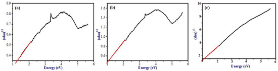 Tauc plots for the calculation of band gap energy in (a) graphite (G), (b) graphene oxide (GO), and (c) nickel(II)-bipyridine complex-modified graphene oxide (Ni-GO) nanocomposites. Note: The black line represents the data, while the red line represents the fitting.