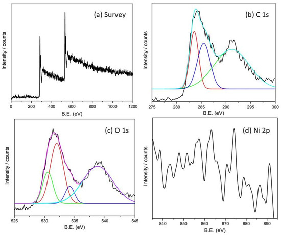 Figure 7a illustrates an XPS survey scan spectra of Ni2+-modified GO. The two strong peaks at about 284 and 532 eV correspond to the binding energies that are assigned as C 1s and O 1s orbitals, respectively. GO was confirmed in Figure 7b,c similarly to the reported work [27,28,29,30,31,32]. The peaks in Figure 7d depict high-resolution spectra of Ni 2p orbitals of Ni2+ ions in our prepared sample. The peaks at 857 and 874 eV correspond to the binding energies of Ni 2p3/2 and Ni 2p1/2. Four electronic signals were seen from the high-resolution spectrum of Ni 2p before reduction at 856, 838, 865, and 863 eV. These peaks were assigned as the satellite peaks of Ni 2p orbital. The high resolution XPS spectrum did not show any peaks at 854 and 873 eV. These results indicated that Ni present in +2 oxidation alone has no impurity of the zero-valent Ni species.