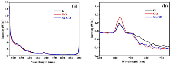Steady state emission spectra ((a) range from 475 to 900 nm and (b) range from 660 to 750 nm) of G, GO, and Ni-GO nanocomposite at λexc = 458 nm.