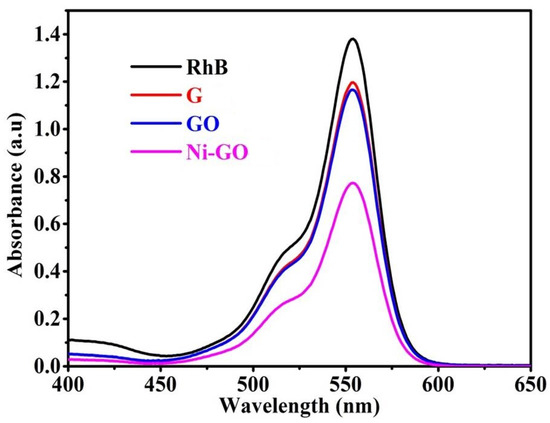 UV-visible spectra of the Rhodamine B (RhB) adsorption solution with the G, GO, or Ni-GO nanocomposite in water.